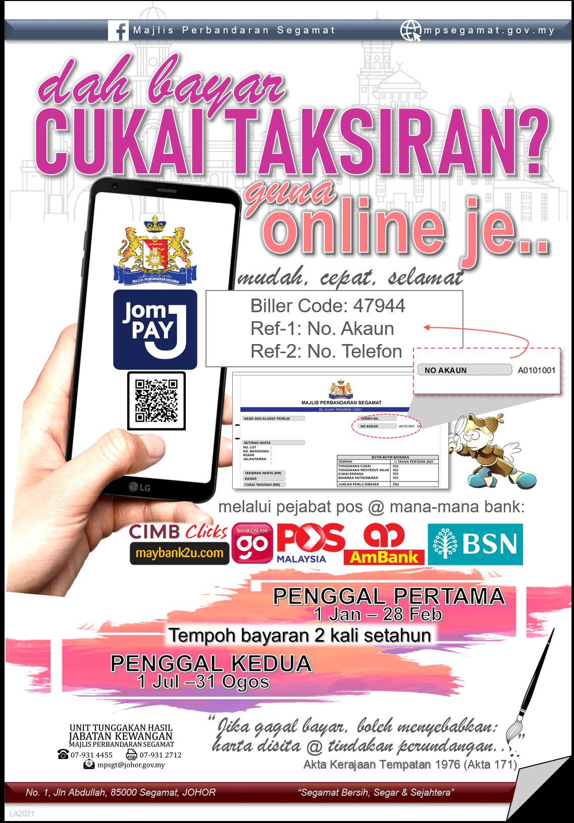 Jom bayar cukai taksiran 2021 setahun untuk mendapatkan payung eksklusif percuma. Jom bayar cukai taksiran majlis perbandaran selayang facebook. Cukai pintu / ses tanah; Memastikan penilaian cukai pintu ke atas harta berkadar dibuat dalam tempoh 3 bulan bekerja daripada tarikh sijil kebenaran menduduki . Lesen / permit majlis (lesen pasar, lesen berjaja, lesen operasi, permit iklan dan permit kakilima) . Bagi memudahkan anda membuat pembayaran cukai taksiran, kami telah menyediakan perkhidmatan pembayaran secara atas talian.